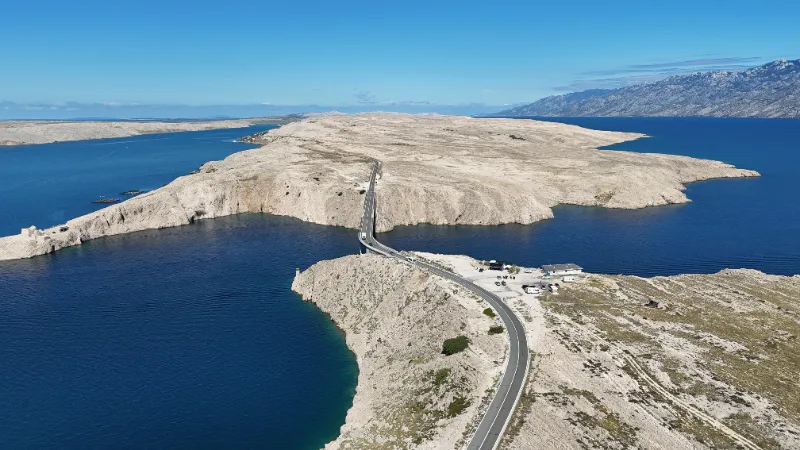 Dramatic karst scenery at the island’s entrance; quick stop for panoramic shots. One of the most striking scenes on the island of Pag is surely the Pag bridge surrounded with dark blue sea providing excellent contrast for unique experience and images.